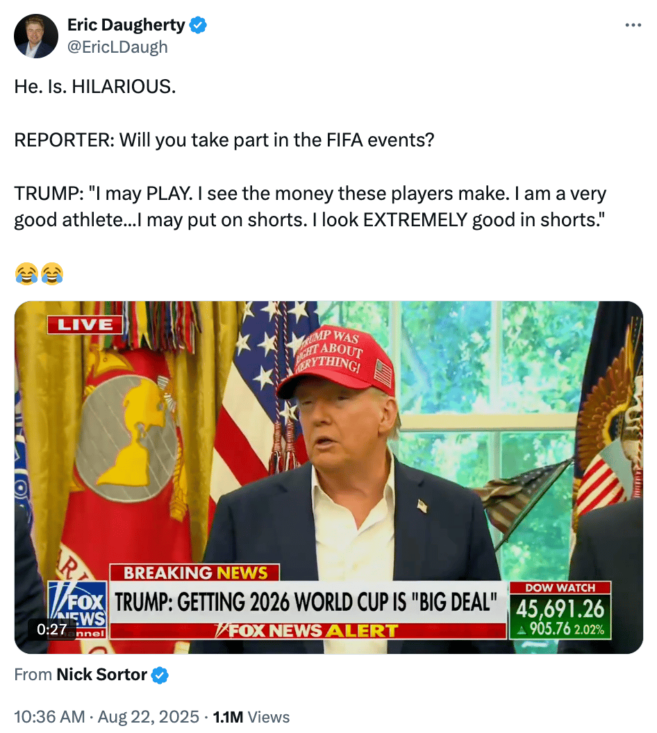 Trump jokes his way through FIFA talk: Asked if he’d take part in FIFA events, Trump grinned: “I may PLAY. I see the money these players make. I am a very good athlete… I may put on shorts. I look EXTREMELY good in shorts.” Reporter laughed, Trump laughed — internet broke.